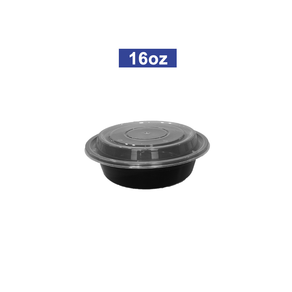 The 78-Series 16oz Black Round Meal Prep Container features a secure transparent lid and black base. Microwave-safe, fridge-friendly, and stackable for compact storage. Ideal for individual portions in the North American market.