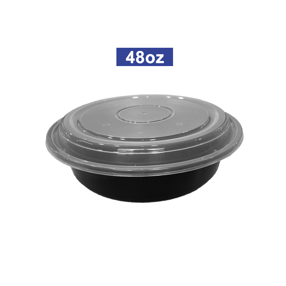 The 78-Series 48oz Black Round Meal Prep Container is perfect for catering or large gatherings. Transparent lid, black base, and stackable for bulk storage.