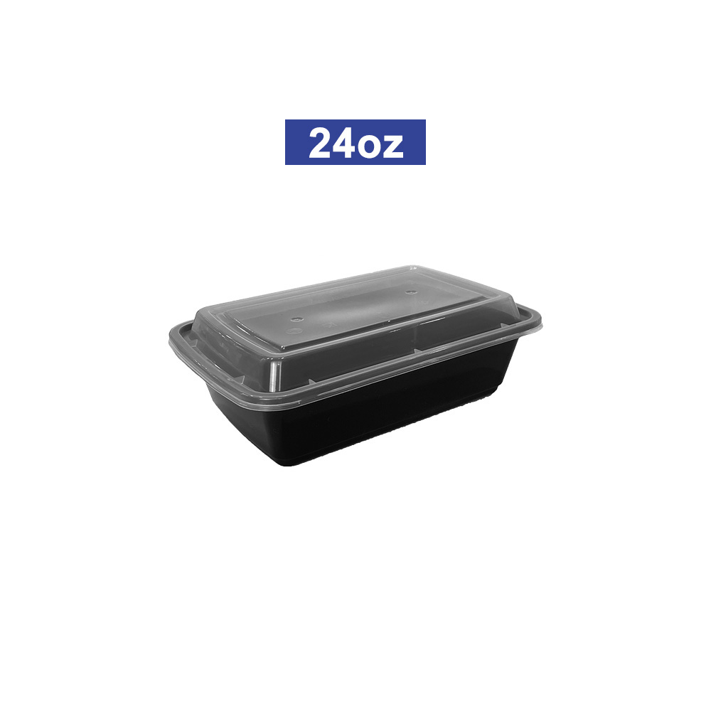 A-Series 24oz Plastic Meal Prep Container for larger portions. Transparent lid, black base, and stackable design. Compatible with microwave and fridge.