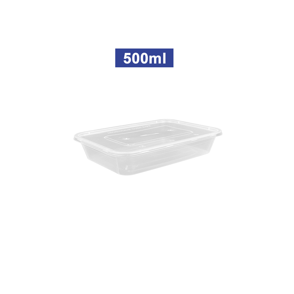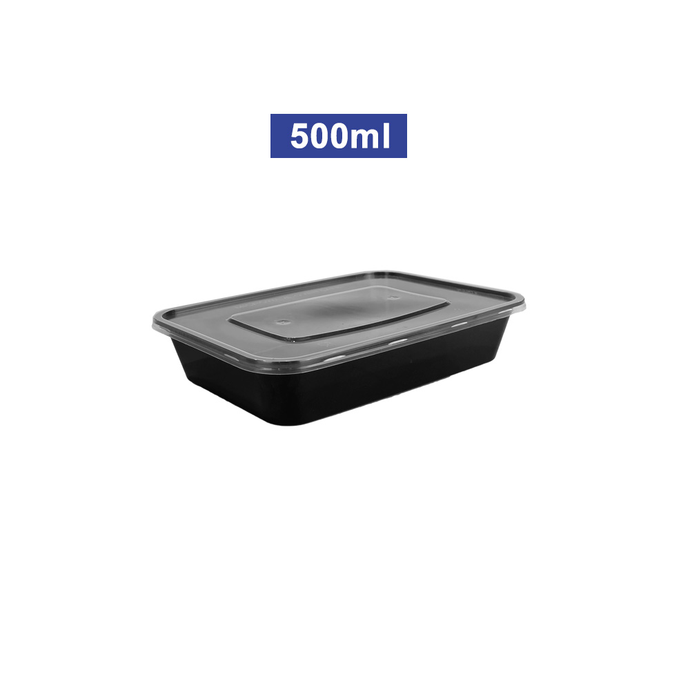 This 500ml rectangular food container features a transparent lid and a black/clear base. Microwave-safe, fridge-friendly, and leak-proof for secure food storage. Flexible yet durable, ideal for salads, snacks, or takeout.